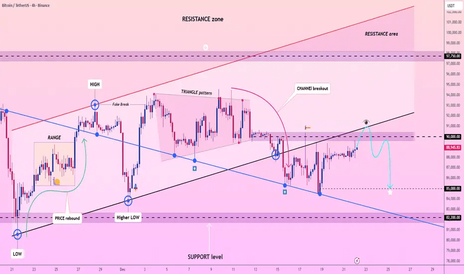 BTCUSDT se nepodařilo udržet nedávný průlom kanálu, přičemž cena sklouzla zpět pod 90 000 pivot a vytvořila další slabou reakci pod klesající rezistencí. Falešný průlom nad trojúhelníkovou strukturou naznačuje vyčerpání, zatímco poslední odraz vypadá spíše korektivně než impulzivně. Chování trhu stále naznačuje distribuci poblíž středního rozsahu spíše než obnovenou akumulaci.