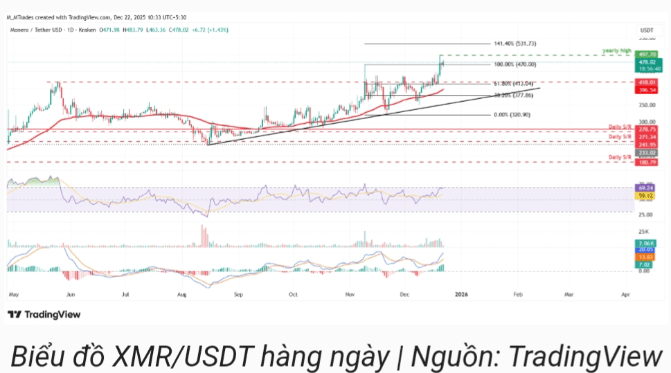 Monero (XMR) pokračuje v obchodování pevně nad úrovní 477 $ na začátku týdne, po stanovení nového ročního maxima minulý týden. Silná kombinace býčích on-chain dat, rostoucí aktivity derivátů a zlepšující se technické struktury posiluje očekávání, že XMR by brzy mohl překonat psychologickou překážku 500 $.