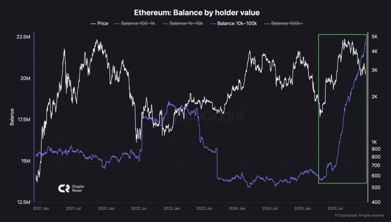 Na tomto pozadí je obzvlášť patrné chování velkých držitelů. Podle on-chain pozorování, peněženky s velmi velkými zůstatky nadále zvyšovaly zásoby ETH, přičemž trend trvá několik dní a zesiluje se při poklesech. To je klasický vzor „chytrého průměrování“: velký kapitál zřídka honí impulz, ale ochotně shromažďuje likviditu, když je trh zklamaný a připraven prodávat levněji.