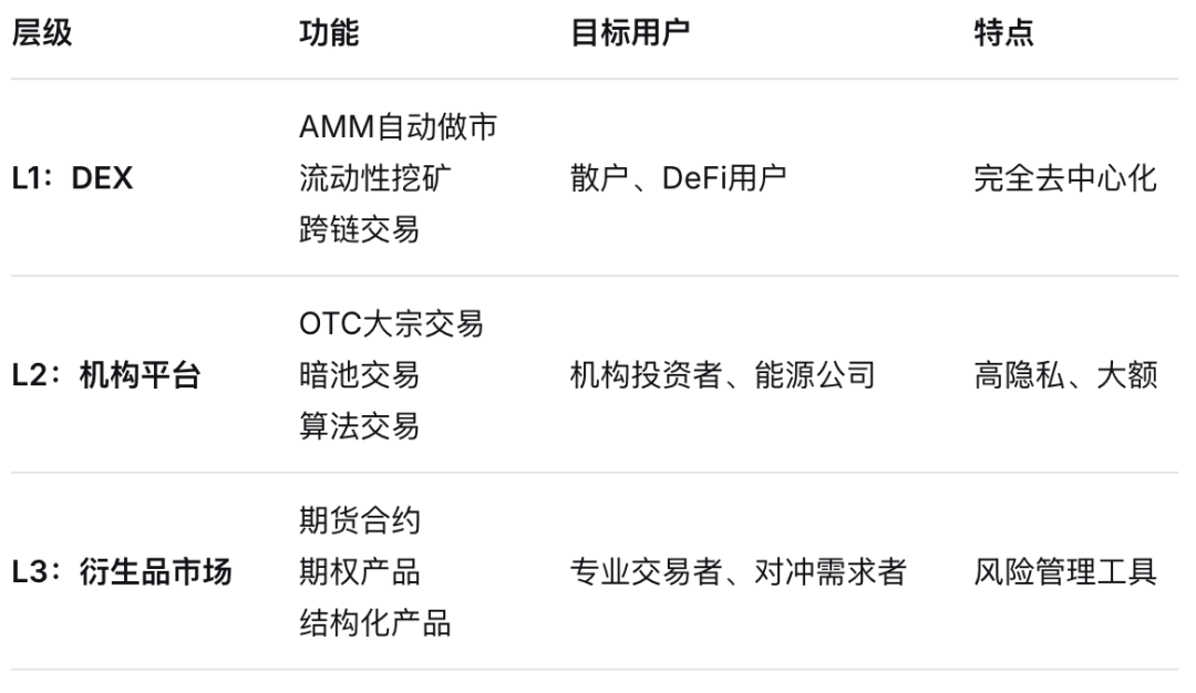 Vytvoření tříúrovňové evoluční cesty od digitalizace specifických aktiv → vertikální průmyslové obchodní platformy → obecné energetické finanční veřejné blockchain, konečným cílem je stát se „blockchain Nasdaq + základní zúčtovací síť“ pro energetická aktiva.