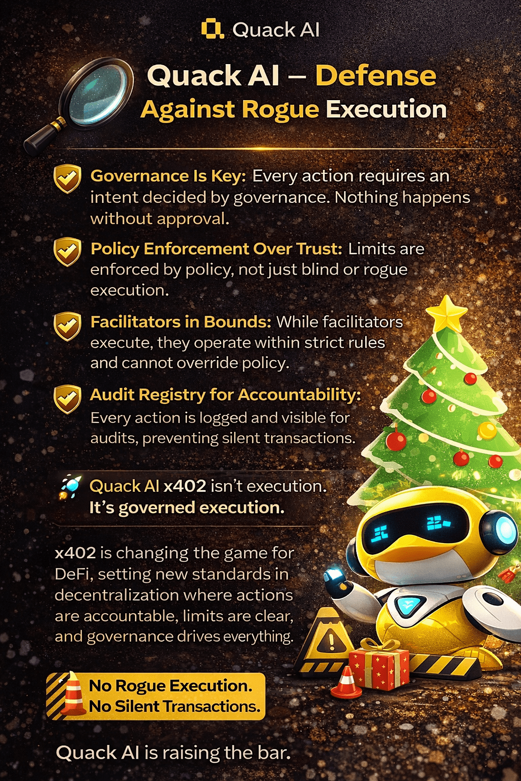 Většina systémů se spoléhá na podepisovatele a důvěru. Quack AI to nahrazuje prováděním řízeným politikou, rozhodnutími řízenými vládou a plnou odpovědností.