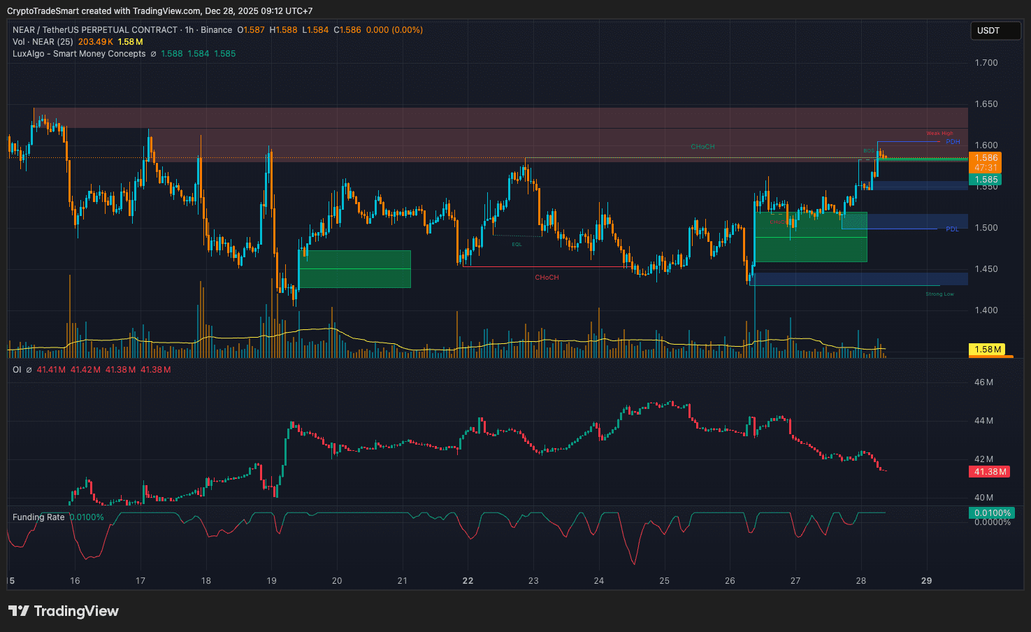 Zásah likvidity pod 1.45 (Silné minimum) → Potvrzený býčí CHoCH