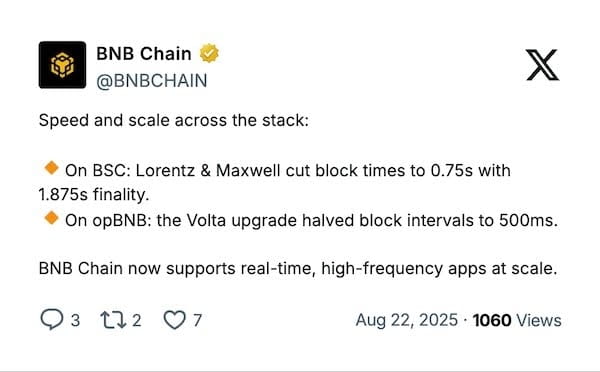 BNB Chain využil rok 2025 k tiše upgradu základů: rychlejší bloky, levnější poplatky a plynulejší zkušenost pro zaneprázdněné aplikace na řetězci.