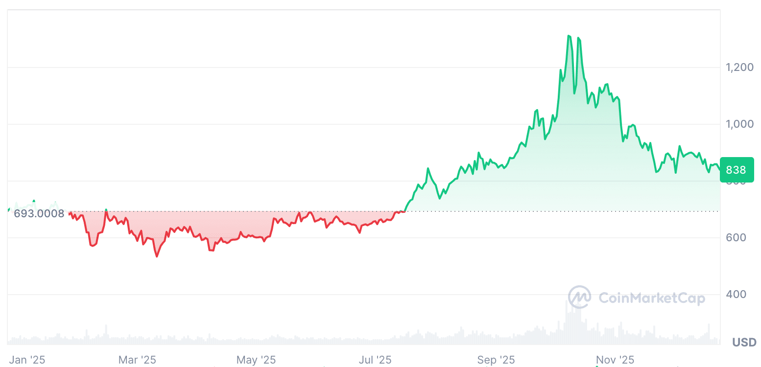 K okamžiku psaní je BNB obchodován přibližně za $838. Nicméně, na základě historického cenového chování se zdá být dobře umístěn k obnovení cenového bodu $1,000 v roce 2026.