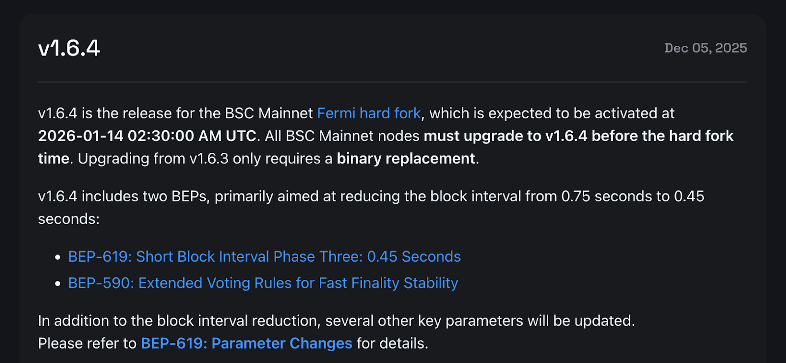 Klíčově, rok 2026 není jen "více téhož." Začíná s upgrady, které jsou již naplánovány. Hardfork Fermi je naplánován na mainnet 14. ledna 2026 a má za cíl dále zúžit smyčku zkrácením intervalu bloků na 0,45 s, zlepšení stability rychlé finality a dodání efektivních primitiv jako EVM Super Instructions.