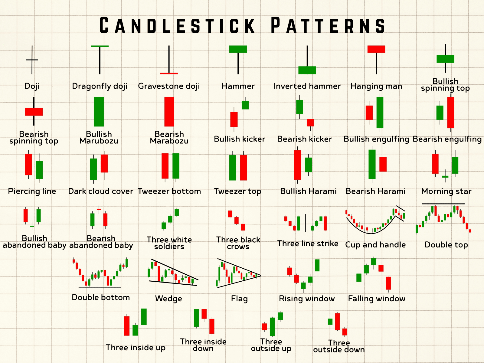 Grafické vzory jsou rozpoznatelné tvary vytvořené pohybem cen v čase. Tyto vzory, tvořené více svíčkami, používají obchodníci k identifikaci potenciálního směru cen a udržení nebo obrácení trendu. Běžné příklady zahrnují trojúhelníky, hlavy a ramen, dvojité vrcholy/dno. Interpretovaly se k předpovědi pravděpodobných pohybů trhu.