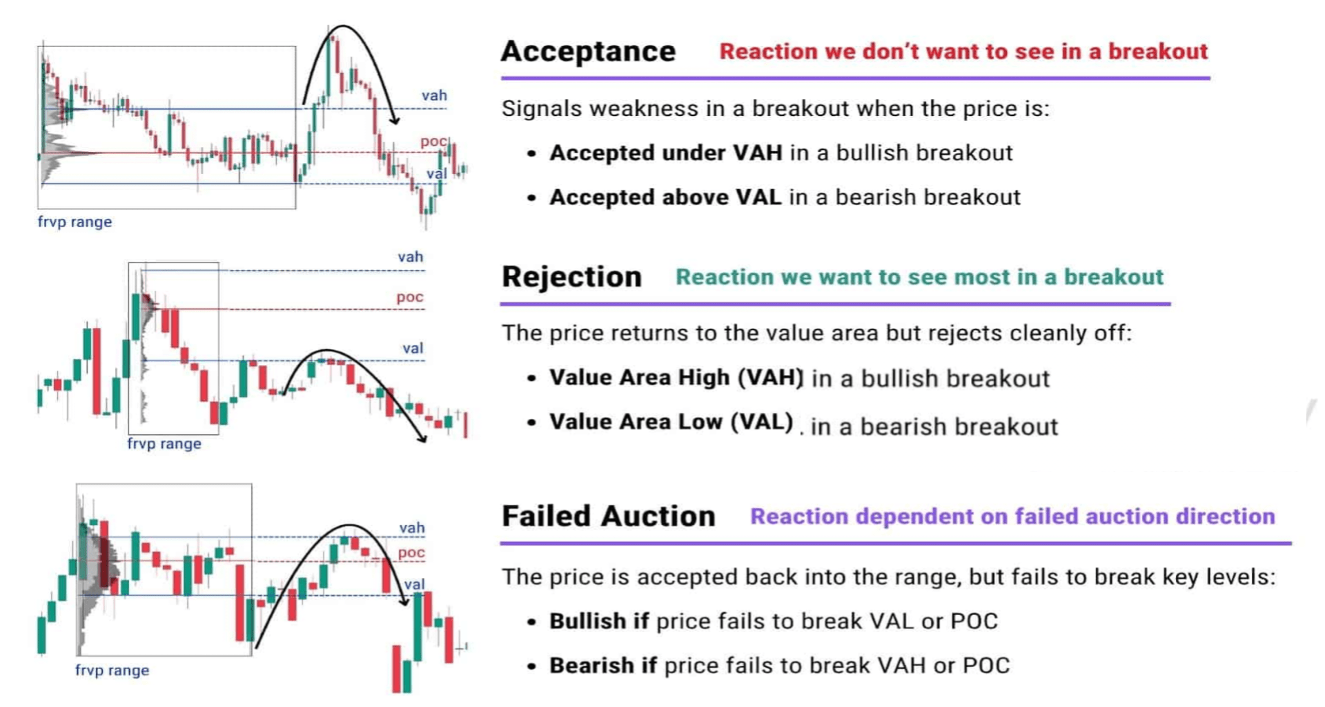 Reakce trhu popisuje chování ceny v klíčových technických úrovních. Odmítnutí ceny nastává, když cena rychle odkloní od úrovně (např. podpora/odpor nebo trendová čára), nechávajíc na svíčce dlouhou chvostu. To signalizuje, že úroveň je stále silná a pravděpodobně nastává obrácení. Naopak přijetí ceny nastává, když cena projde úrovní (např. breakout) a konzoliduje se nebo pokračuje mimo ni bez významného zpětného pohybu. To potvrzuje, že úroveň byla překonána a potvrzuje nový směr trendu. Zásadně říká, že odmítnutí ukazuje sílu úrovně, zatímco přijetí potvrzuje její selhání a změnu tržní struktury.