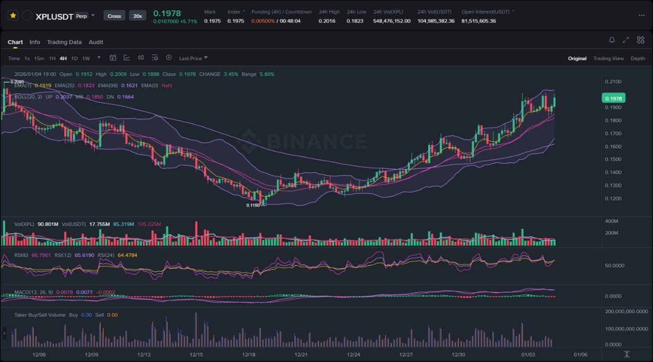 Pár XPL/USDT na Binance ukazuje dynamickou intradenní strukturu za poslední období, charakterizovanou impulsivním náročným výstupem z mnohodenního poklesového kanálu. Chování ceny odhaluje několik klíčových pozorovatelných prvků: jasná odmítnutí na nedávném swing low kolem úrovní začátku prosince, následované rozšířením volatility s prodlouženými horními výběžky na hodinových svíčkách, což naznačuje agresivní nákupní tlak; úzká konsolidace těsně pod odporovou úrovní $0,17 před 15% nárazem; a nyní rané známky distribuce s divergencí objemu, když cena testuje lokální swing highy. Indikátory momentum, včetně RSI, který stoupá nad 70, a MACD s bullším křížením a rostoucími sloupci histogramu, zdůrazňují riziko krátkodobé přehřátosti. Celkově je struktura nakloněná kladně, protože rozhodný breakout z kanálu a vyčištění předchozích minim absorbovaly prodejní tlak a umožnily vyšší minima – což naznačuje akumulaci, nikoli vyčerpání. Nicméně bez potvrzeného vyššího objemu při retestech může dojít k přechodu do rozsahu.
