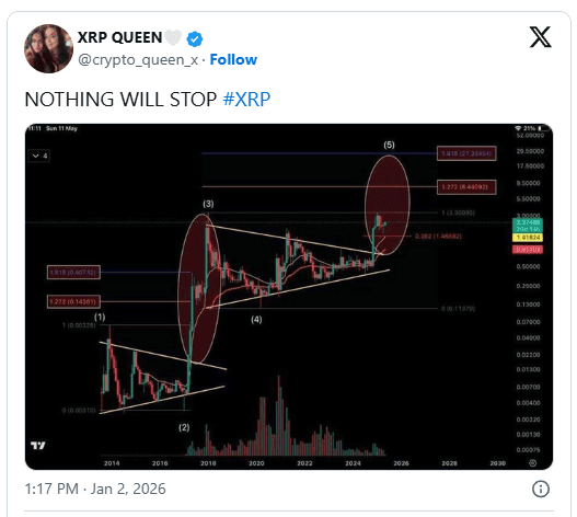 Analytik známý jako XRP Queen (@crypto_queen_x) sdílel dlouhodobý graf XRP a sebevědomě řekl: „NIC NESTOPNE XRP.“💪