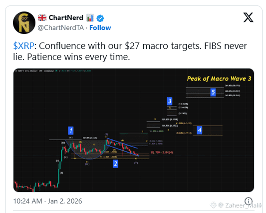 Renowned crypto analyst ChartNerd (@ChartNerdTA) has released a long-term technical analysis of XRP, pointing to a possible massive upside move toward $27. The analysis is based on a strong alignment between Fibonacci extensions and a developing Elliott Wave structure on the weekly XRP/USD chart.