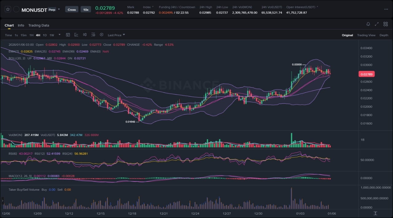 MON se v současnosti obchoduje kolem 0,02679 USD, což ukazuje na ostrý impulsivní breakout z vícedenní konzolidační oblasti. Aktivum stoupla z nedávných minim kolem 0,021 USD, což představuje zisk 28 % za poslední týden, i přes krátký 7% klesnutí na začátku. Kapitalizace se pohybuje v prostředním segmentu altcoinů, přičemž objem za posledních 24 hodin se zvýšil na úrovně, které nebyly viděny od počátečního náporu na trhu. Tento pohyb probíhá ve stínu širšího obnovení kryptomarketu, kde stabilizace BTC nad 90 000 USD uvolnila kapitál pro vysoký beta výkony jako MON. Klíčové ukazatele ukazují na vyšší open interest, což naznačuje zajímavé pozice s pákovým efektem, které mohou zvýšit volatilitu.