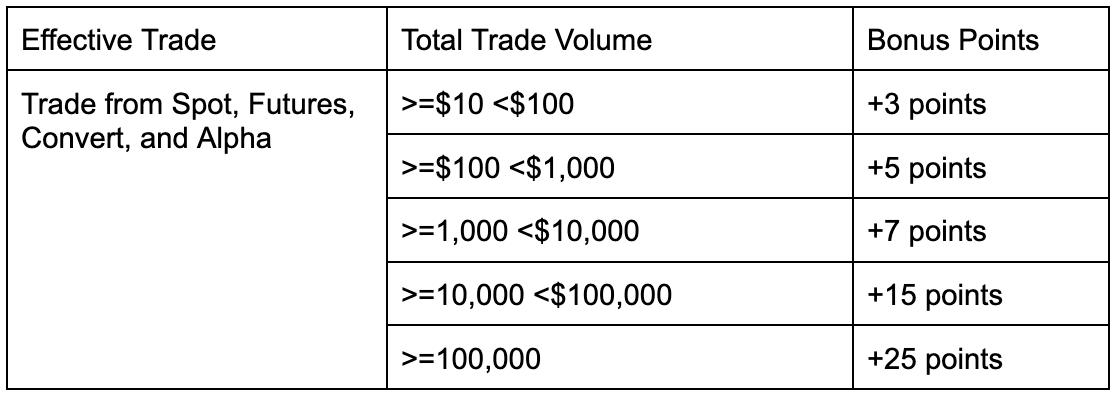 Můžete získat až 25 bodů za den na projekt z efektivních obchodů, které jste provedli na burze Binance (peněženka není zahrnuta).