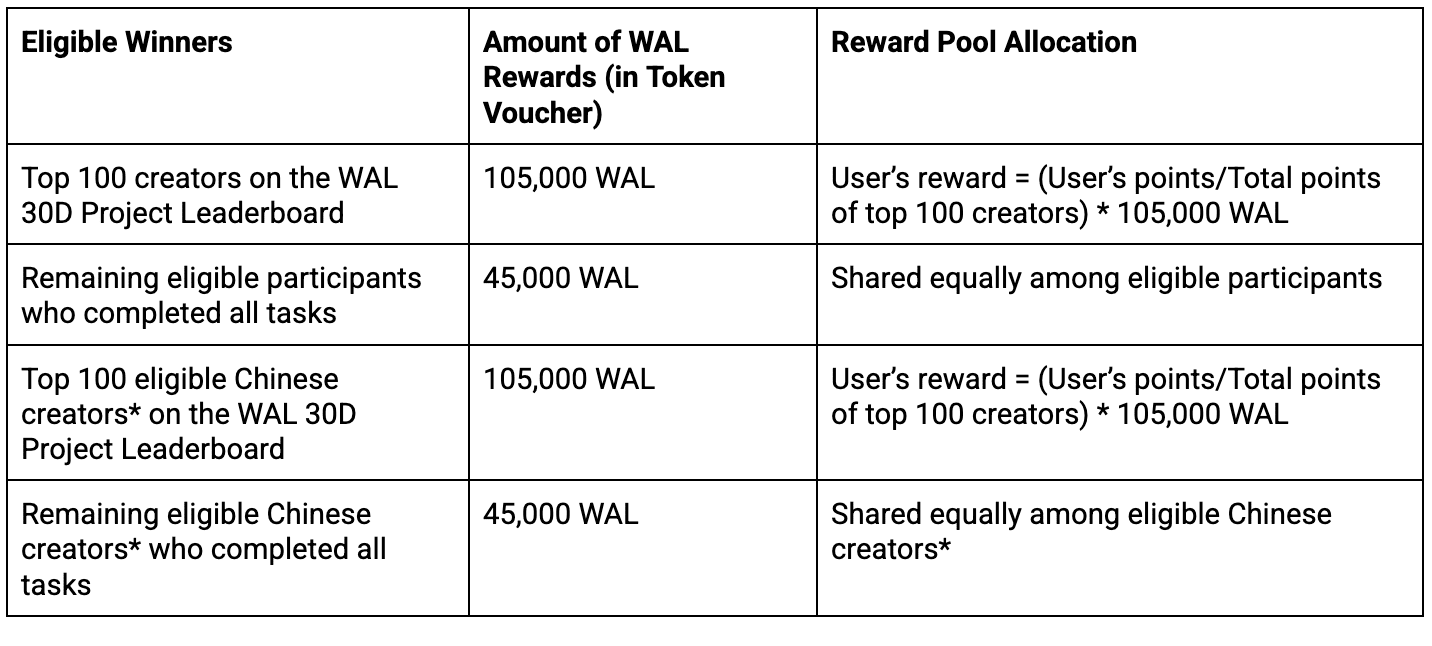 Kvalifikovaní uživatelé jsou zařazeni podle výsledků prvních 30 dnů na tabulce výkonnosti k datu ukončení aktivity, aby mohli získat odměnu ve výši 300 000 WAL, jak je uvedeno v následující tabulce.