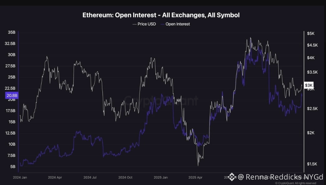 Ethereum’s open interest is rising again after a steep multi-month decline, showing fresh long positions are being added. This reflects some renewed optimism in derivatives markets, but the price hasn’t followed with equal strength.