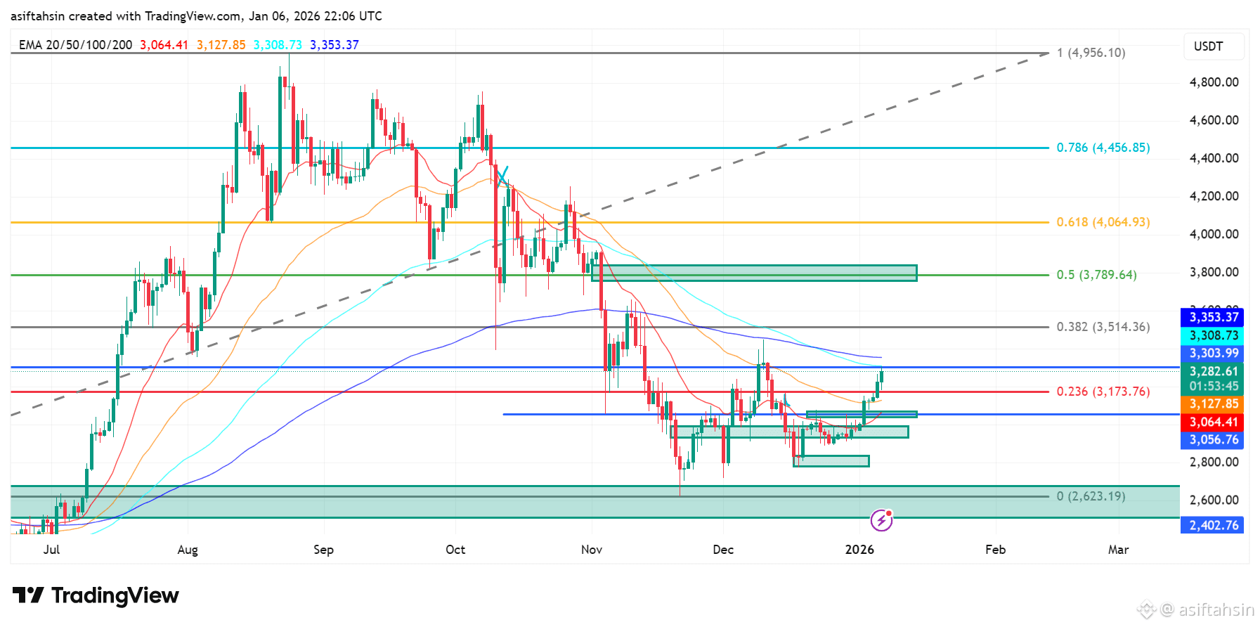 A sustained move above $3,175 (0.236 Fib) opens upside toward $3,500–$3,790, where heavy Fibonacci and EMA confluence resistance exists. A structural shift would require acceptance above $3,790 (0.5 Fib).