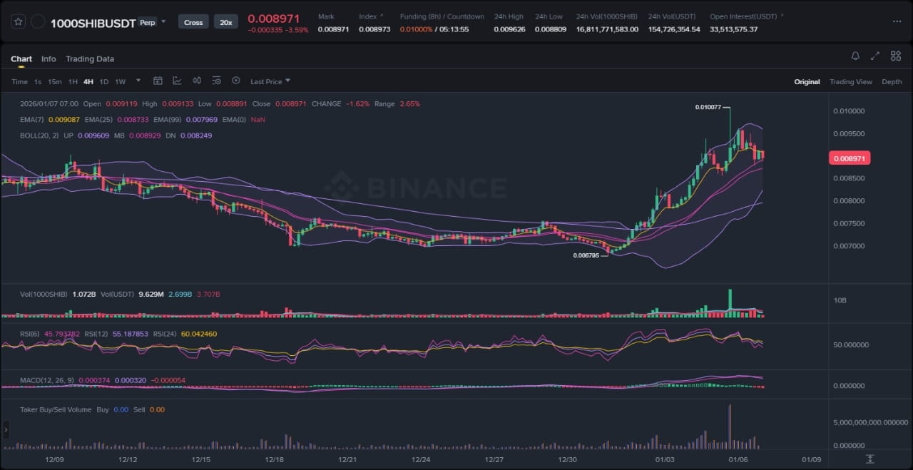 Bez nedávných zpráv dostupných v přehledu je analýza pro 1000SHIB primárně řízena technickými faktory spíše než fundamentálními katalyzátory. Tato absence aktualizací může být interpretována jako neutrální téma, mírně medvědí na trhu, kde ticho často zesiluje rizika poklesu pro tokeny s menší kapitalizací jako 1000SHIB, neboť zájem investorů slábne bez pozitivního vývoje. Historicky, zprávy související s SHIB - jako jsou partnerství, uvedení na burzy nebo oznámení o rychlosti spalování - poháněly býčí běhy, ale současná prázdnota naznačuje smíšené pocity v nejlepším případě, bez býčích nebo medvědích extrémů, které by mohly ovlivnit cenu. Témata specifická pro projekt chybí, což znamená, že neexistuje posílení pro vzestup z růstu ekosystému, zatímco makro faktory jako regulační dozor nad meme mincemi zůstávají přetrvávajícím medvědím podtextem. Témata burz a trhu jsou rovněž tišší, bez zpráv o zvýšeném poskytování likvidity nebo výkyvech obchodního objemu na platformách jako Binance. Celkově, tato prázdnota zpráv mírně odporuje neutrálnímu rozsahu grafu, potenciálně signalizující fázi distribuce, kde absence pozitivních zpráv umožňuje grabování likvidity níže, spíše než událost prodávat zprávu, protože zkrátka není žádná zpráva, kterou by bylo možné prodat.