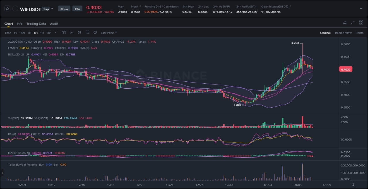 Ve volatilním světě mincí s memy je dogwifhat (WIF) významným aktivem založeným na Solaně, které upoutalo pozornost obchodníků svým zábavným značením a ostrými výkyvy cen. Obchoduje kolem 0,41 USD v době, kdy se celkový trh pohybuje s mírnými poklesy u Bitcoinu, přičemž nedávné pohyby WIF naznačují potenciální scénář buď pokračování růstového tlaku nebo návrat k ustanoveným rozsahům. Jako seniorí analytik kryptomarketu na Binance Square tento přehled analyzuje akci ceny na připojeném grafu, integruje poslední tři novinky a popisuje pravděpodobnost různých scénářů bez poskytování přímého investičního doporučení. Prozkoumáním technických ukazatelů jako EMA a Bollingerovy pásky spolu s RSI a MACD odhalujeme oblasti s vysokou pravděpodobností a klíčové pozorovací body pro informované sledování.