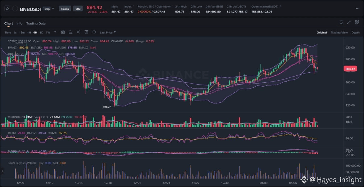 BNB's current market positioning reveals a token grappling with a short-term downtrend within a broader consolidation phase, as evidenced by its recent dip below the $885 level. The overall structure suggests a range-bound environment following an earlier impulsive rally that peaked near $950 in late December, now testing lower boundaries amid waning bullish momentum. Drawing from the attached chart, which displays a 4-hour timeframe, we observe several critical elements: a clear rejection at the recent swing high around $940, followed by a consolidation pattern resembling a descending triangle, and an expansion in volatility as price probes lower liquidity pockets near $880. The Exponential Moving Averages (EMAs) provide further clarity— the 7-period EMA has crossed below the 25-period EMA, signaling bearish alignment, while both remain beneath the 99-period EMA, confirming the downtrend's dominance. Bollinger Bands are contracting slightly after a volatility spike, with the price hugging the lower band, indicative of potential mean reversion if support holds, but also heightened risk of a breakdown if selling pressure intensifies.