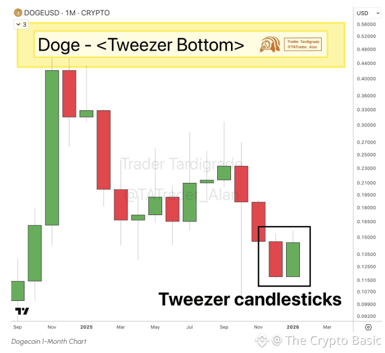 Elsewhere, on X, analyst Trader Tardigrade points out that Dogecoin is showing a pair of Tweezer candlesticks on the monthly chart, signaling a potential bullish reversal. The candles represent the price between $0.117 and $0.156.