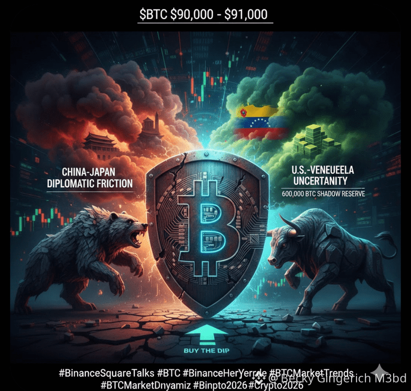 $BTC is currently hovering in the $90,000 – $91,000 zone. While we saw a massive surge to $94K earlier this week, the "risk-on" appetite is facing some serious geopolitical headwinds. 🌪️