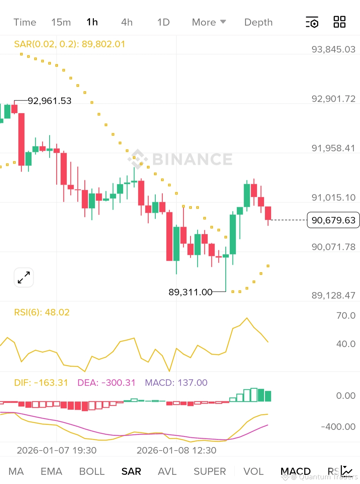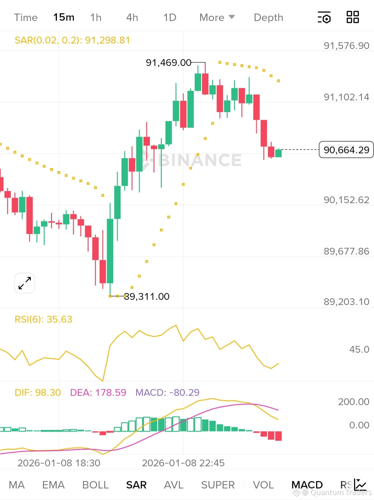 Price: Pullback from ~94.8k to ~90.6k = healthy correction