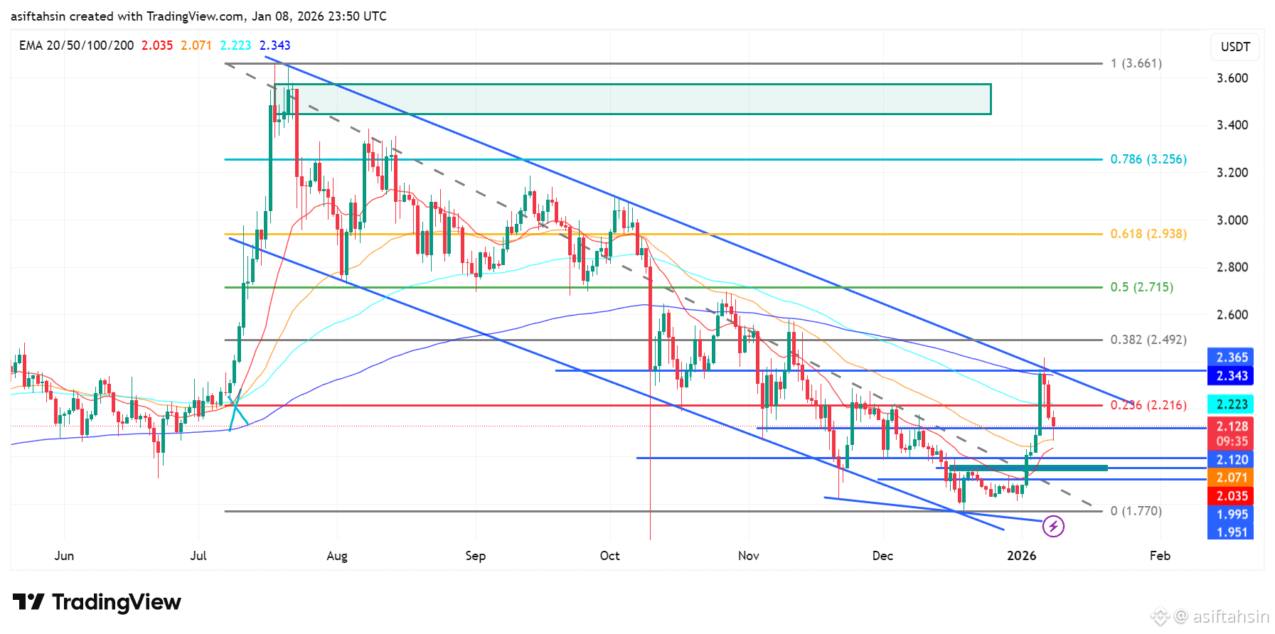 A sustained move above $2.22 (0.236 Fib) opens upside toward $2.49–$2.72, where strong Fibonacci, EMA, and channel confluence resistance exists. A meaningful structural shift would require acceptance above $2.71 (0.5 Fib).