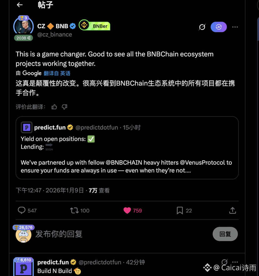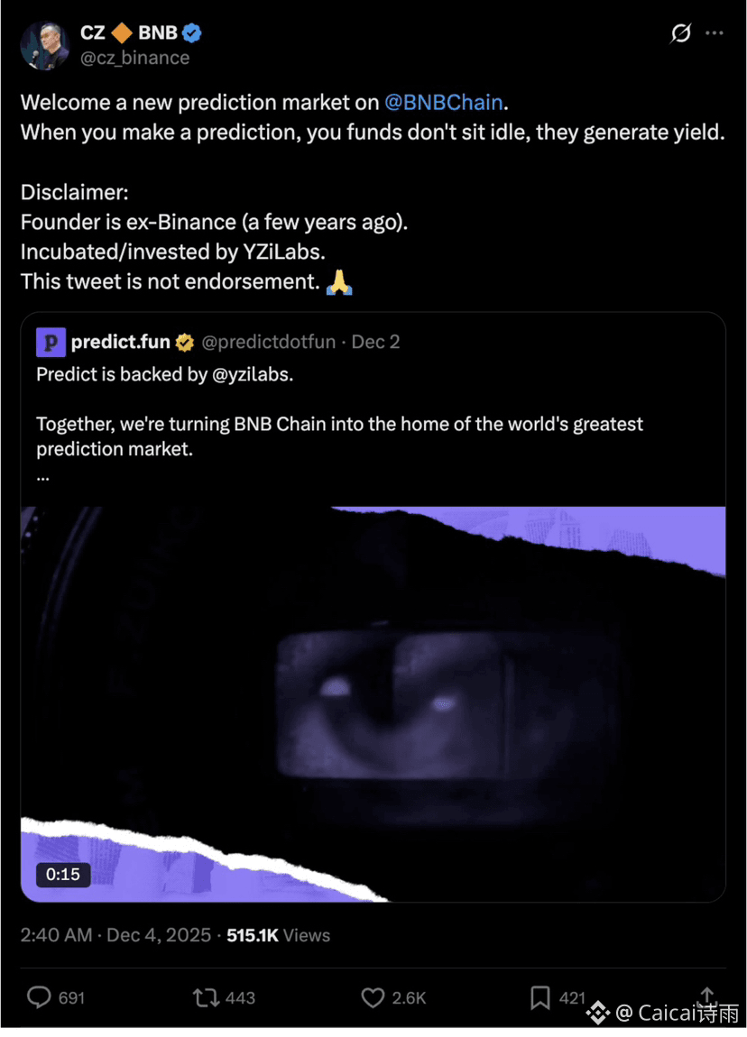 刚好在写这篇文章时候看到CZ有提到Predict.fun