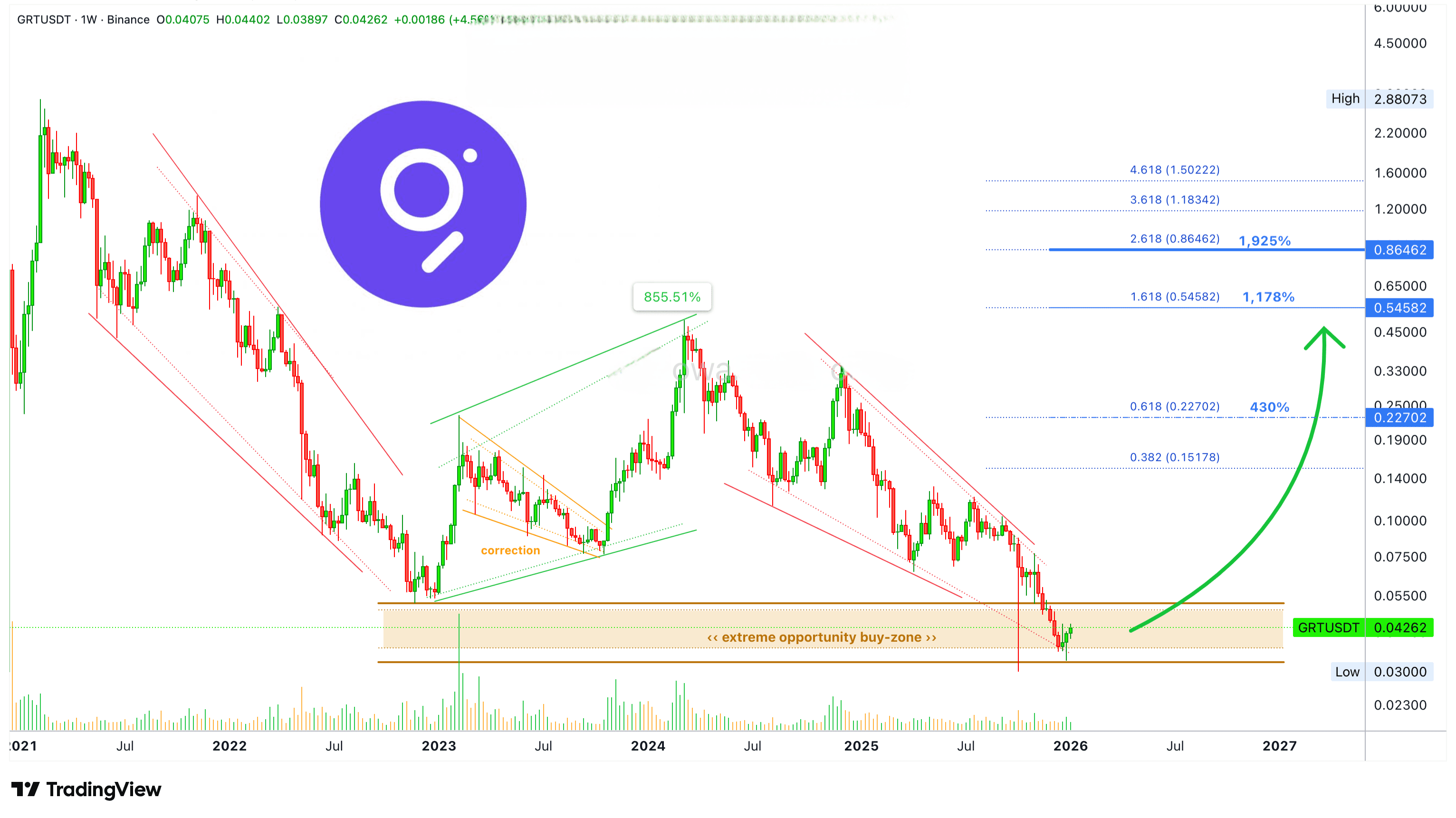 Druhý způsob, jak na to pohlédnout, závisí na předchozím zkušenostem a pohybu trhu jako celku: protože GRTUSDT prošla úplnou reinitializací – nedávno byl dosažen nový historický minimum – jsou dveře otevřeny pro velkou nástupnou fázi. Proto můžeme očekávat významný růst na dlouhodobé perspektivě.
