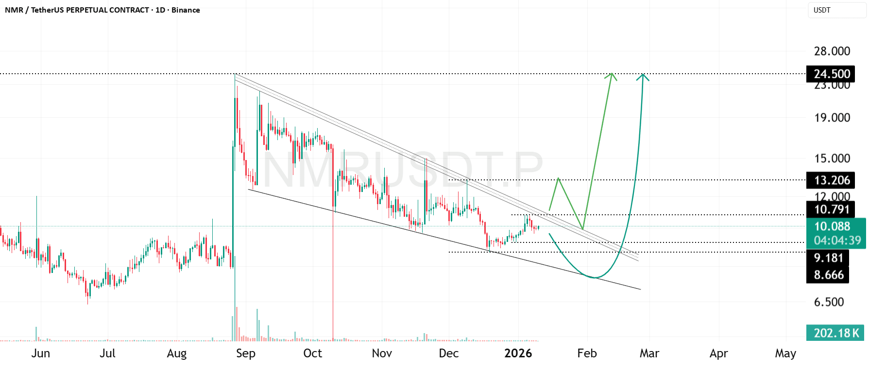 NMR se obchoduje uvnitř struktury klesajícího trojúhelníku, přičemž cena se komprimuje mezi klesající odporovou úrovní a stoupající poptávkou. Toto je klasický vzestupný obratový vzor vznikající po prodlouženém poklesu.