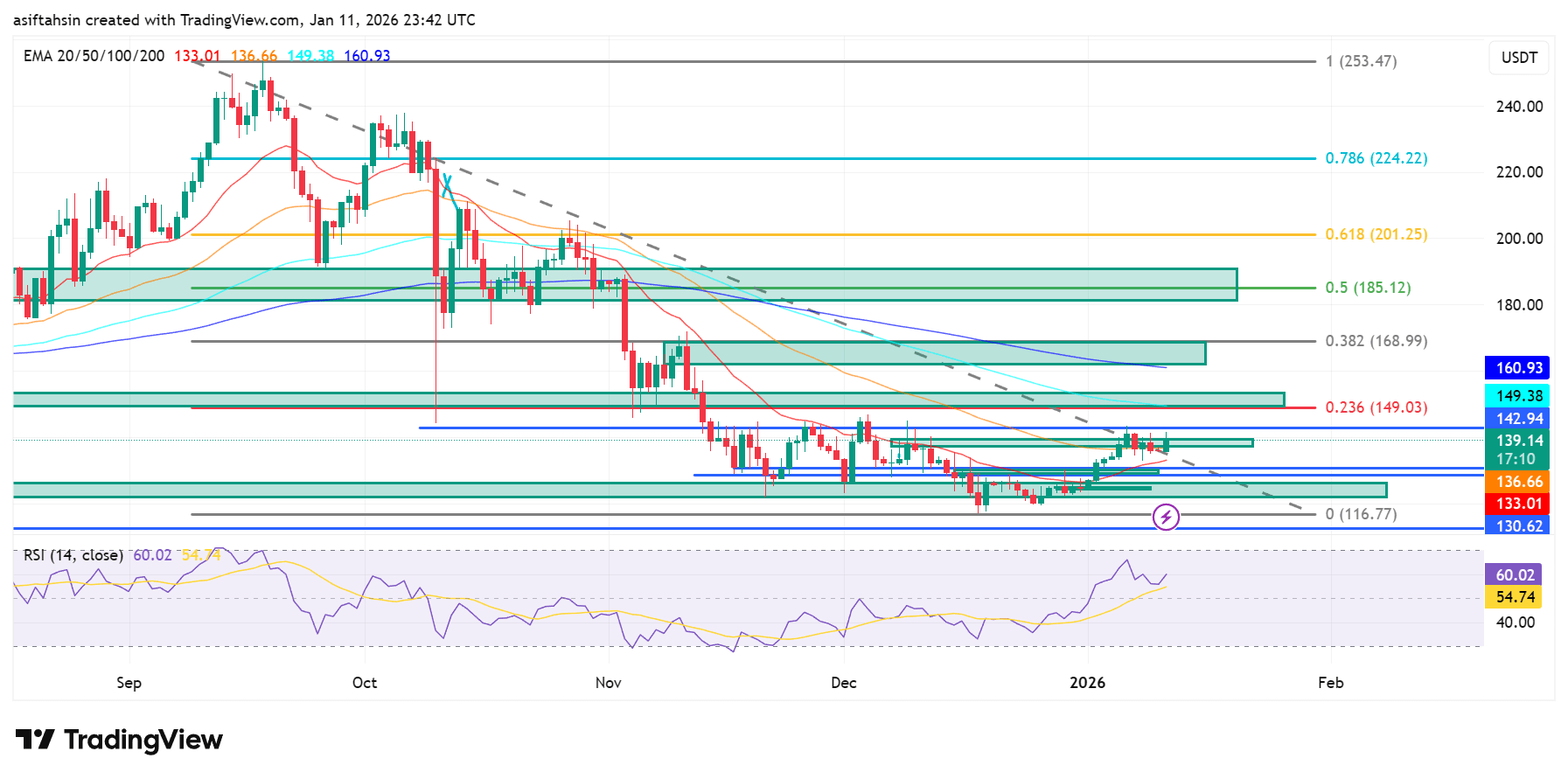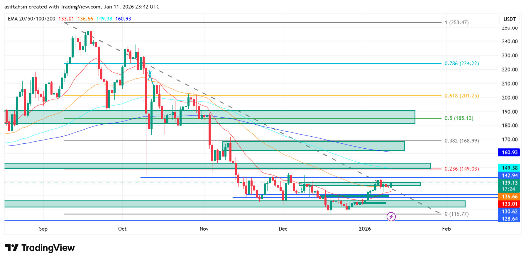 Trvalý pohyb nad $149 (0,236 Fib) by otevřel prostor pro růst směrem k $168–$185, kde je silná konvergence Fibonacci a EMA odporu. Významná strukturální obnova by vyžadovala přijetí nad $185 (0,5 Fib).