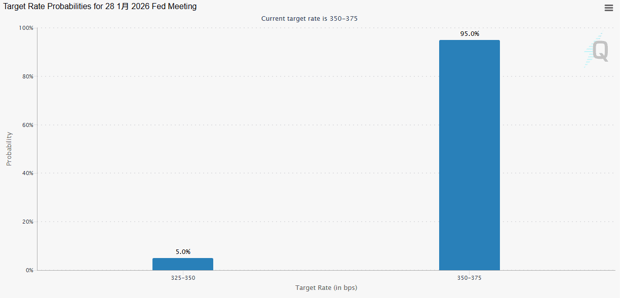 ● Po zveřejnění údajů o nezaměstnanosti trh rychle reagoval. Futures na federální fondy CME ukazují, že trh snížil pravděpodobnost snížení úrokových sazeb o 25 bazických bodů v lednu z 11 % na pouhých 5 %, zatímco pravděpodobnost udržení sazeb beze změny vzrostla na 95 %.