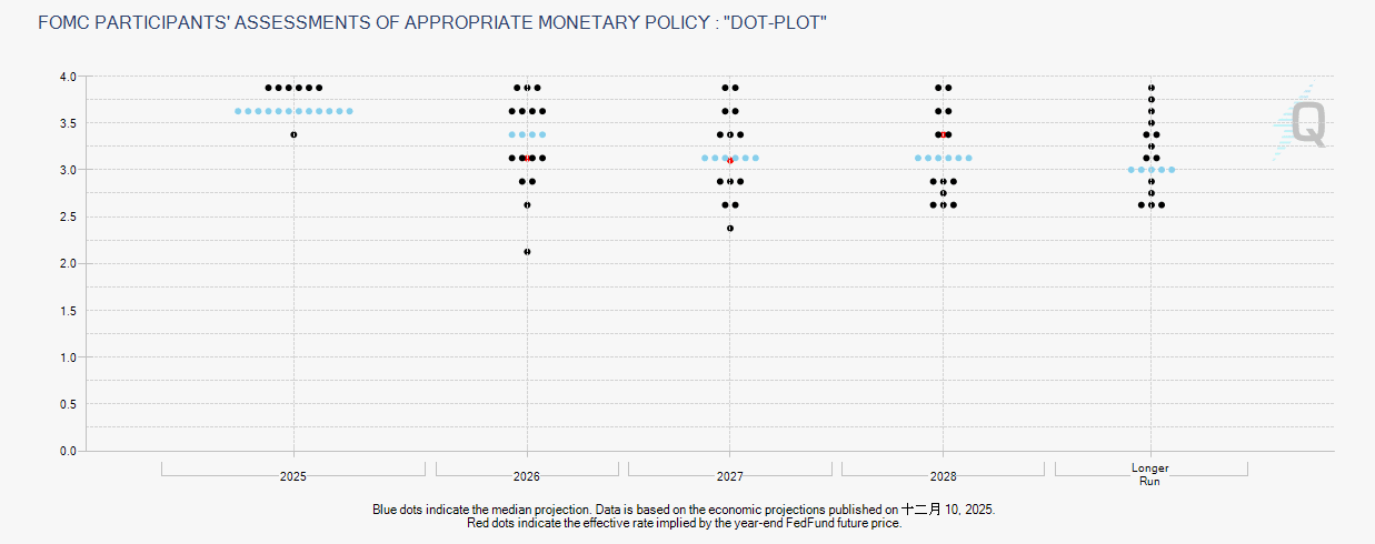 ● Úpravy očekávání trhu a rychlost ukazují, že obchodníci téměř vyloučili možnost snížení sazeb v lednu, naděje na snížení sazeb na začátku roku byla v podstatě zmařena. Po celý rok trh stále očekává, že Fed sníží sazby přibližně o 50 bazických bodů v roce 2026, ale časování snížení bylo odloženo. Očekávaný čas prvního snížení sazeb se posunul z začátku roku na červen.