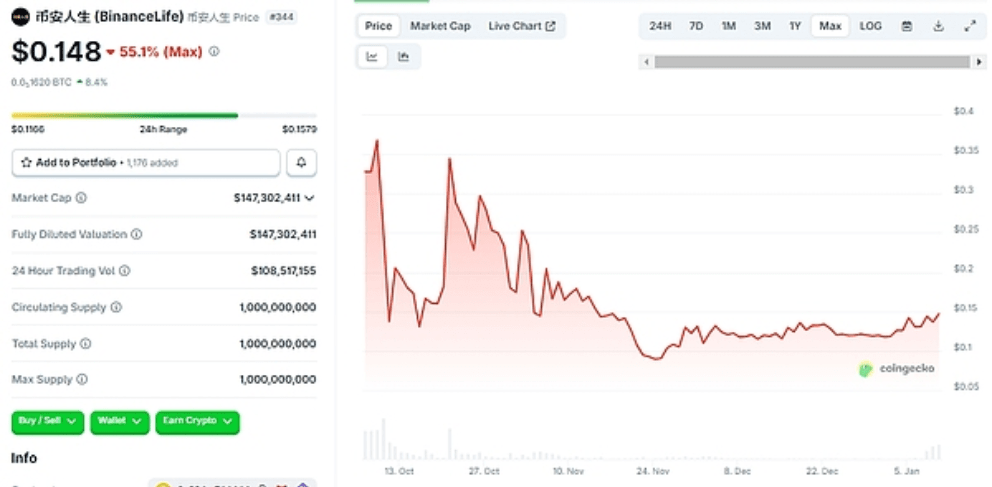 K 9. lednu, tržní kapitalizace čínského Meme coinu „Já jsem tady“ klesla z vrcholu na přibližně 13 milionů dolarů. Cena Binance Life je 0.148 USD, což je pokles o 55.1 % oproti vrcholu.