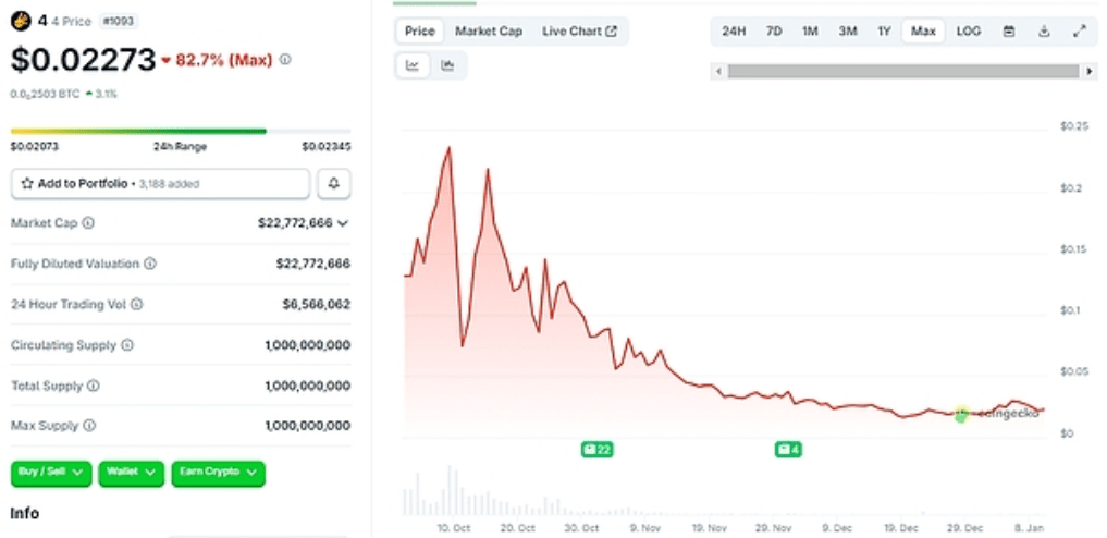 ● Původ tokenu „4“ je docela dramatický; vznikl z hackerského phishingového útoku na BNB Chain, při kterém hacker získal pouze 4000 USD. CZ dříve uvedl, že komunita převzala tuto transakci a koupila tento Meme coin za vyšší cenu, aby se posmívala hackerovi.
