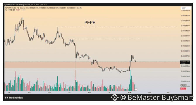 👉 Why this matters for meme coins. PEPE often acts as the canary in the coal mine for meme coin sentiment. When price holds demand after a violent shake, it usually means overleveraged positions got flushed out. No confirmation of direction yet, but PEPE staying supported puts it back on the radar as this consolidation plays out. What happens next—whether this base launches into momentum or settles into range—will set the tone for similar high-volatility tokens.
