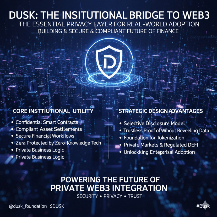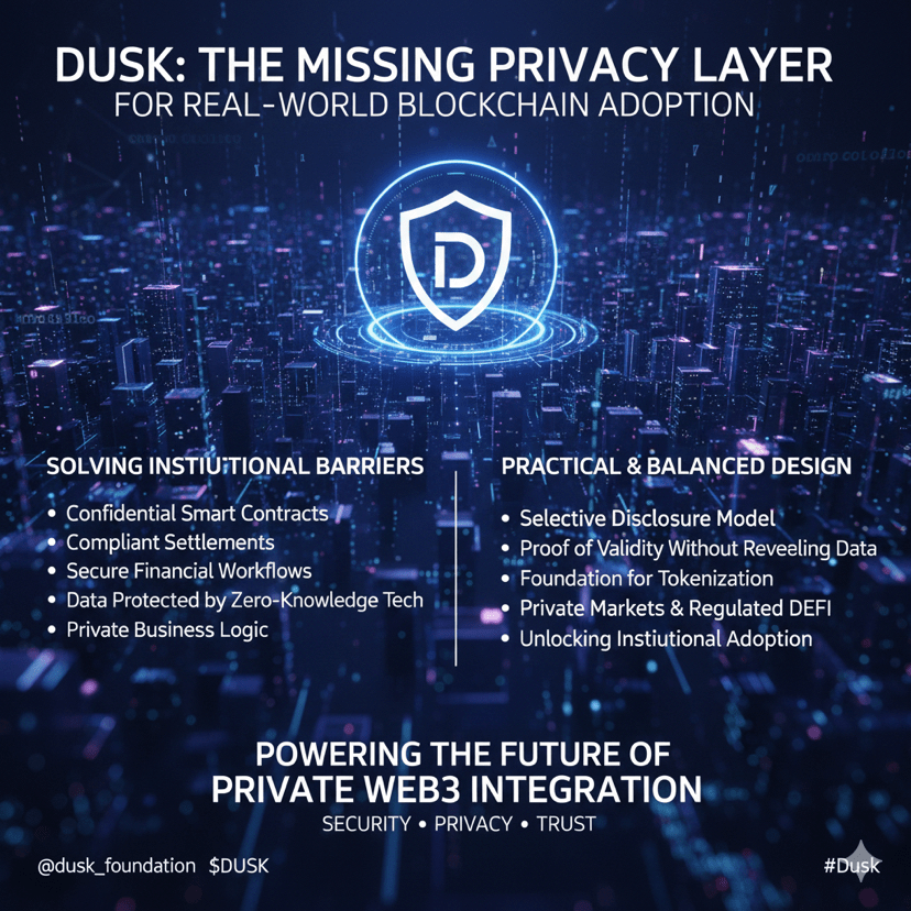 To, co je na #Dusk výjimečné, je jeho praktický design. Podniky nechtějí veřejně odhalovat citlivé finanční logiku nebo obchodní vztahy, přesto potřebují důvěru a transparentnost blockchainu. Dusk vyvažuje tuto rovnováhu. Jeho model selektivního odhalování umožňuje uživatelům dokázat platnost transakcí bez odhalení základních informací. Tento přístup činí z Dusk jednu z nejrealističtějších základen pro tokenizaci, soukromé trhy a regulovaný DeFi. S tím, jak se více odvětví věnuje integraci Web3, se Dusk zdá být infrastrukturou, která otevře další vlnu institucionálního přijetí