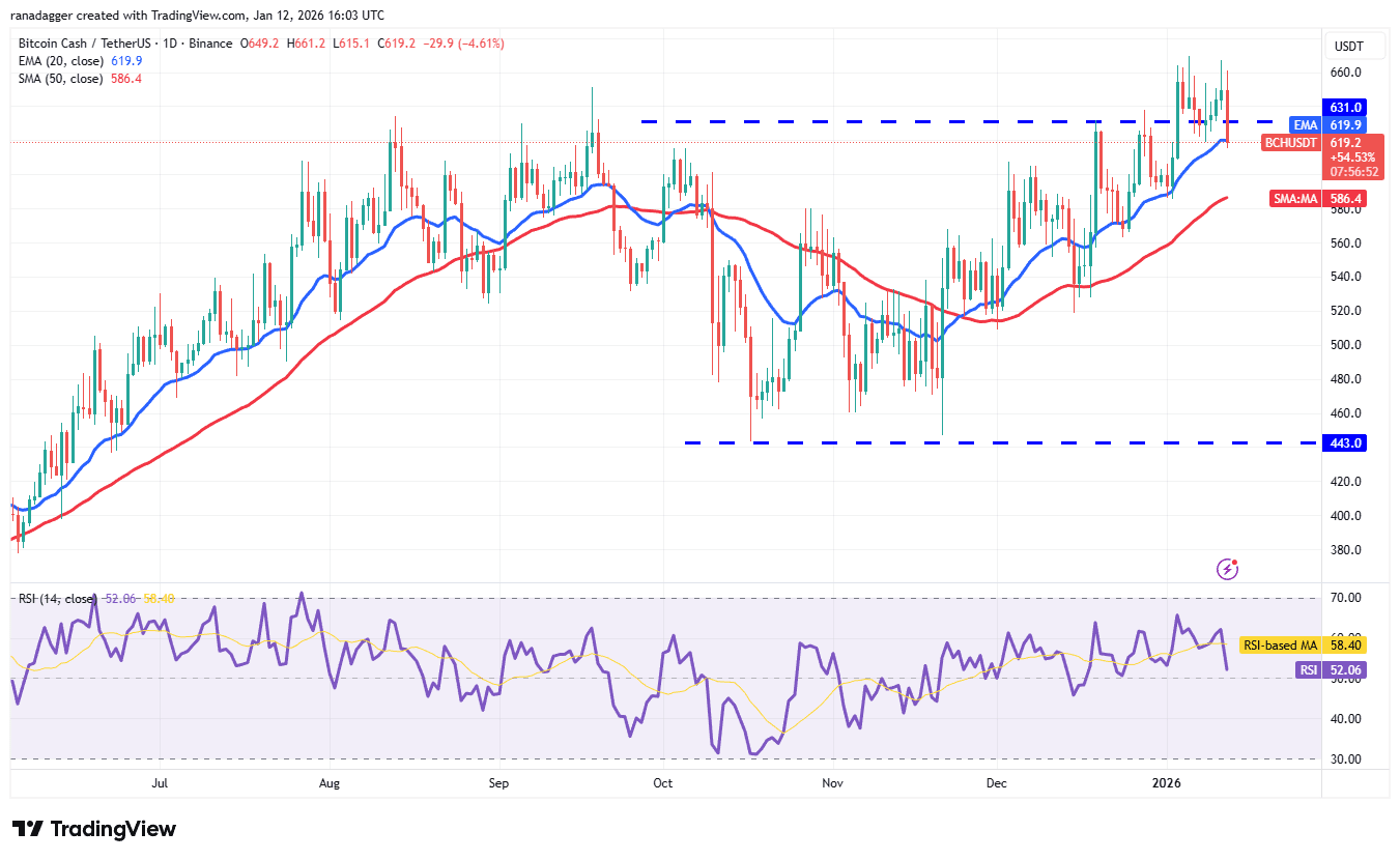 Medvědi se snaží posílit svou pozici tím, že stáhnou cenu Bitcoin Cash pod 20denní EMA (619 $). Pokud to udělají, pár BCH/USDT by mohl spadnout na 50denní SMA (586 $). Očekává se, že kupující budou bránit 50denní SMA, protože uzavření pod ní naznačuje, že průlom nad 631 $ mohl být pastí pro býky. Pár by poté mohl klesnout na 518 $.