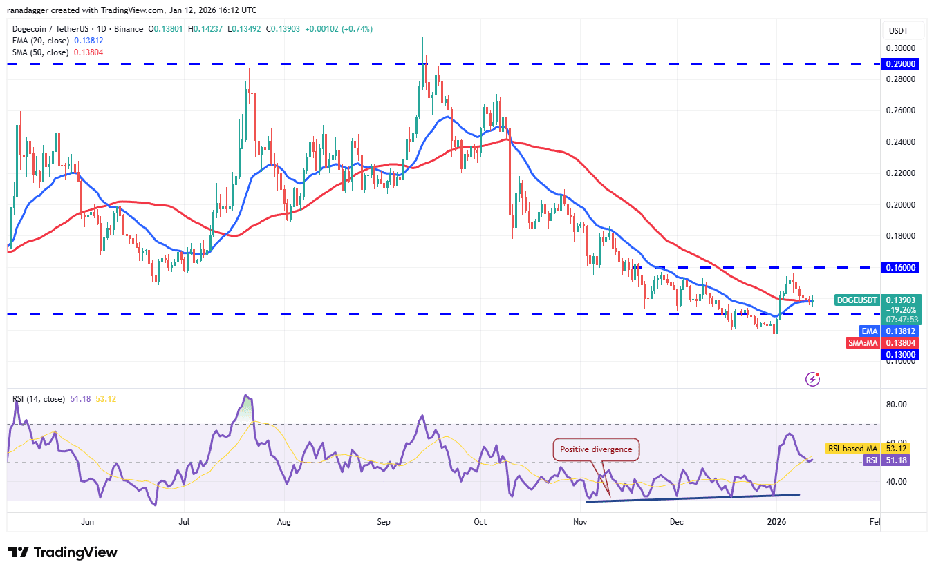 Ploché klouzavé průměry a RSI blízko středového bodu nedávají jasnou výhodu ani býkům, ani medvědům. Pokud cena klesne pod klouzavé průměry, pár DOGE/USDT by mohl klesnout na 0,13 $ a poté na 0,12 $.