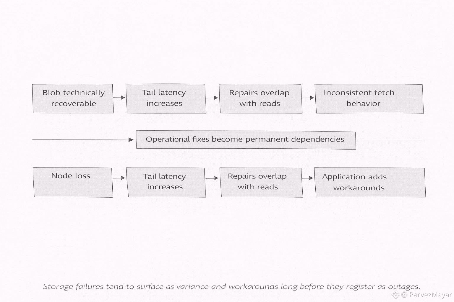 When it is a storage incident, the embarrassment is quiet and operational. You don’t 'lose' the blob in a dramatic way. You get the weaker failure first.. variance. Tail latency that fattens. Repairs that compete with reads at the wrong time. A blob that is technically recoverable but starts feeling conditional. The product team does not argue about cryptography. They argue about whether they can launch without babysitting storage.