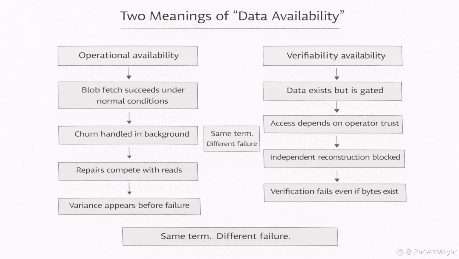 Sometimes 'available' just means a user can fetch the blob while the network is being normal and annoying. Pieces drift. Nodes churn. Repair work exists in the background like gravity. If the blob comes back anyway, nobody claps. They just keep shipping. If it comes back inconsistently, nobody writes a manifesto either. They just start adding rails. Caches. Fallbacks. Little escape hatches that become permanent because support doesn’t accept philosophy as a fix.