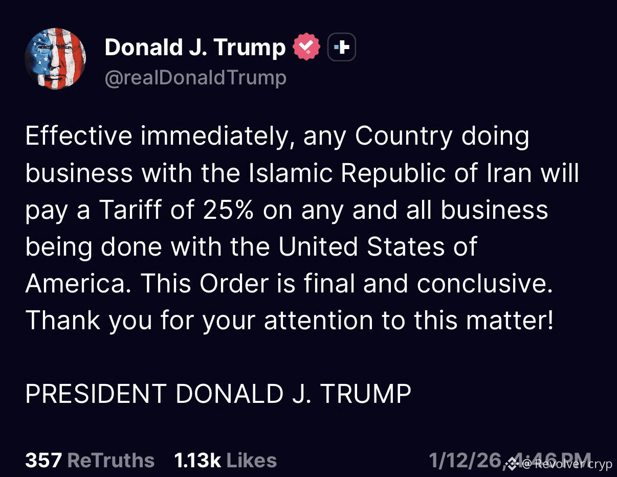BREAKING: President Trump imposes a 25% tariff on any country doing business with Iran.