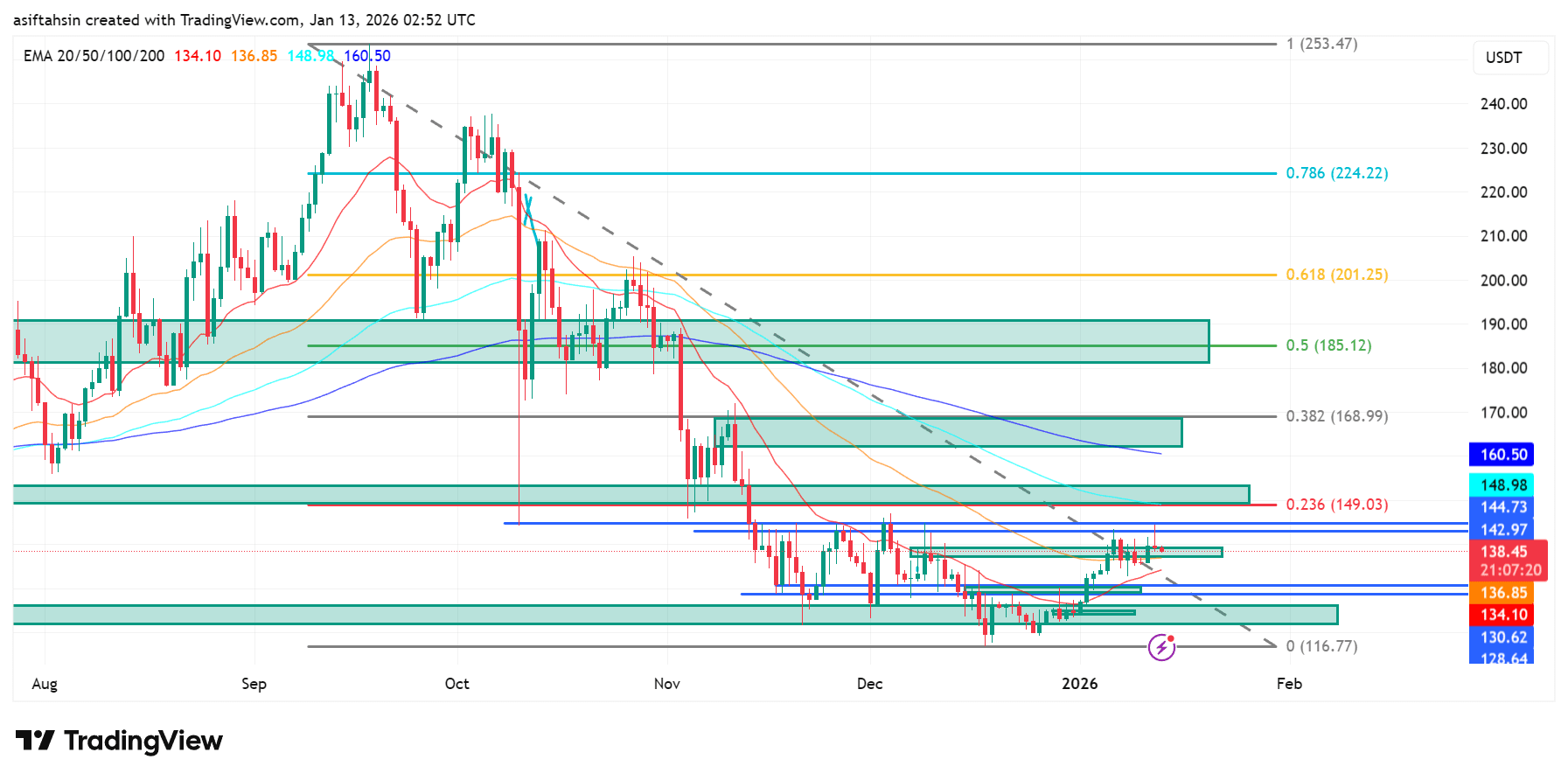 Trvalý pohyb nad 149 USD (0,236 Fib) otevírá cestu směrem vzhůru k 169–185 USD, kde existuje silná konvergence Fibonacci a EMA odporu. Významná strukturální změna by vyžadovala přijetí nad 185 USD (0,5 Fib).