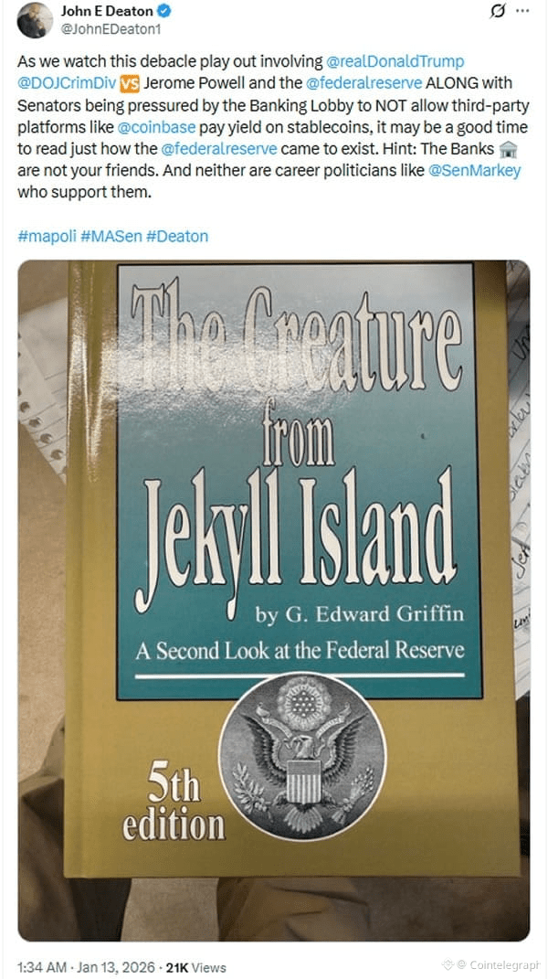 John Deaton recommends a book by G. Edward Griffin that critiques the Federal Reserve System, suggesting it was created in secrecy by powerful individuals. Source: John E Deaton