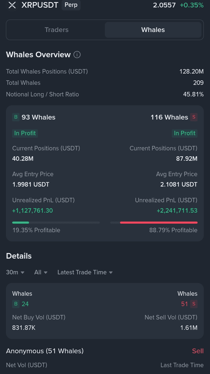 XRPUSDT Perpetual se obchoduje v blízkosti 2,05 USD, přičemž na povrchu se projevuje málo pohybu. Ale data o velrybách ukazují zcela jinou představu.