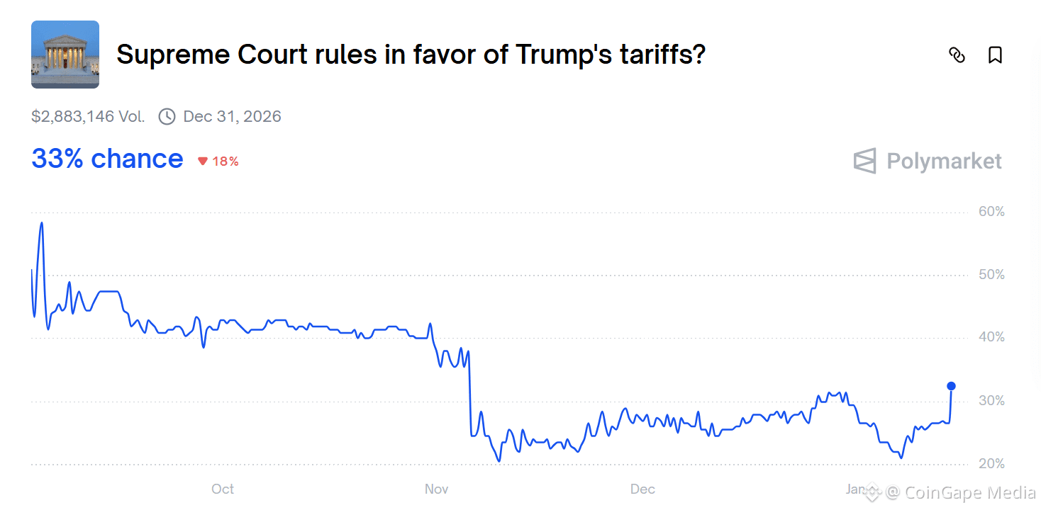 BTC price remains sensitive to the #Supreme Court tariff case because the outcome carries asymmetric macro consequences. While the supreme court delayed issuing a ruling, markets are already pricing the decision itself.