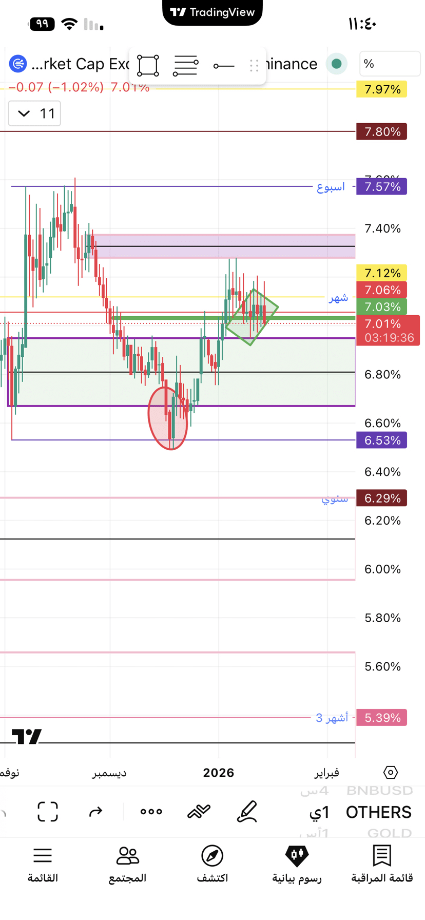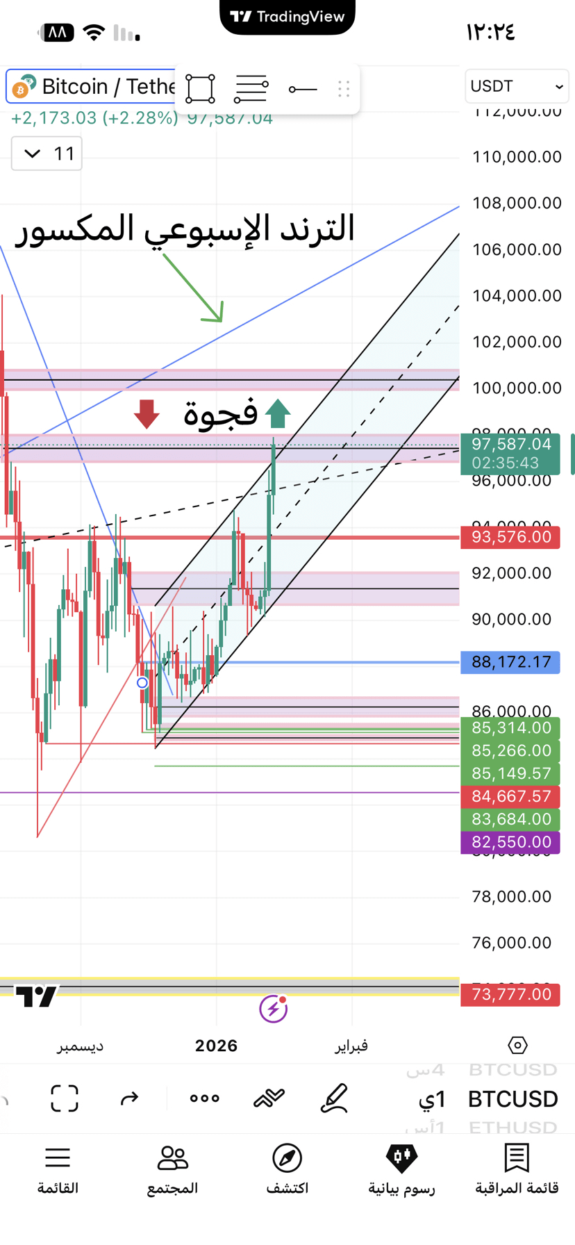Dříve jsem zmínil obtížný úroveň před ním 93500, předchozí roční uzávěrka, a skutečně po překonání této úrovně svíčkou v úterý jsme pozorovali rychlý nárůst, což mu poskytlo větší prostor pro další růst a začátek povolení k opětovnému testování týdenního trendu, který byl přerušen dne 14. listopadu 2025, na úrovni (101000–102000). Od této chvíle aktualizujeme čtení. Pro ty, kdo překročili aktuální stoupající kanál, se odrazili od uvedené mezery – to dává pozitivní čtení, že směr je vzhůru do uvedených oblastí přes horní mezeru.