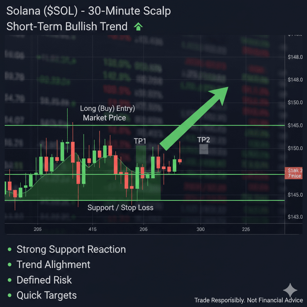 Solana ($SOL) nabízí vysokou pravděpodobnost krátkodobé obchodní příležitosti, protože cena reaguje pozitivně z dobře definované oblasti podpory. Tento nastavení je určeno pro rychlý obchod na 30 minut, v souladu s převažujícím krátkodobým bullským trendem.