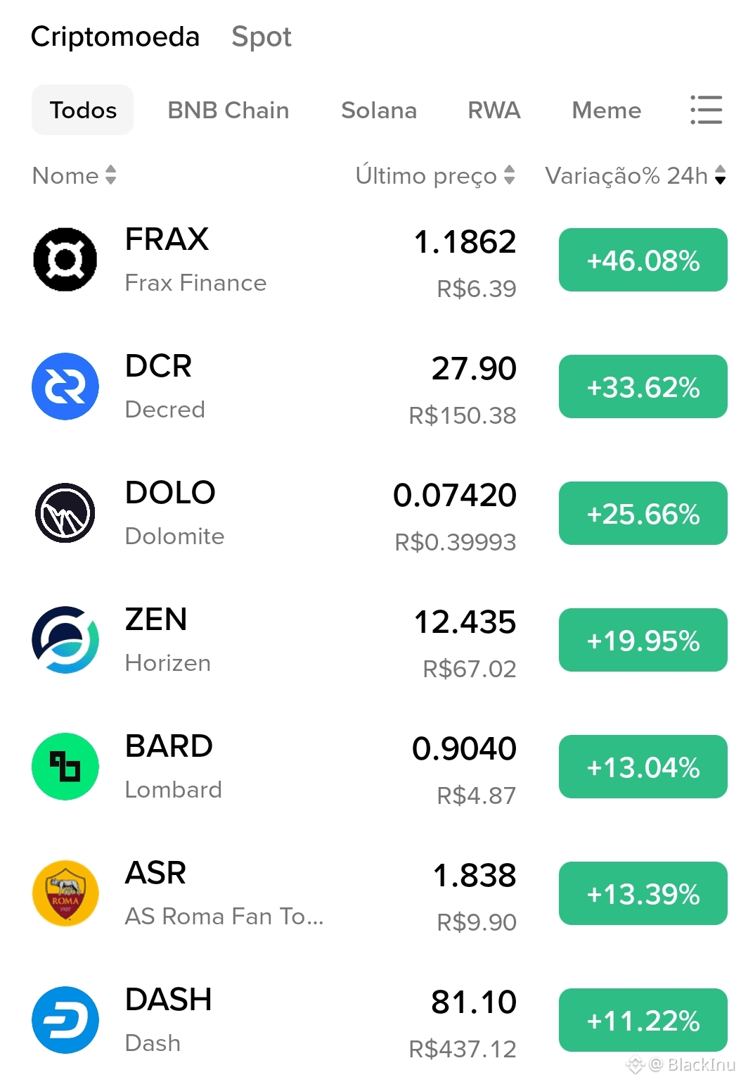 📊 Movimento geral: forte alta entre moedas de diferentes segmentos, com FRAX e DCR liderando os ganhos.