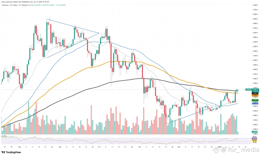 Every rally that came close to this level since May 2025 either stalled or was forcefully sold. The price is acting differently this time. Ethereum is currently trading slightly above the 200 EMA in the neighborhood of $3,350 and, above all, showing acceptance rather than rejection. Rather than a sudden sell-off and a sharp wick, the price is compressing above the level.