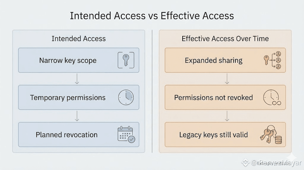 Shortcuts form because friction is expensive. Key rotation is annoying. Revocation breaks flows. Narrow access slows teams down. Under pressure, those costs feel more immediate than abstract privacy guarantees. So behavior adapts. Quietly. The system doesn't object. It can not. It only enforces what it sees.